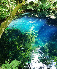 江戸時代の宝永元年(1704)にこの地を襲った大地震によって川が堰き止められ、沢山の湖沼群が誕生しましたが、その中にコバルトブルーの神秘的な水を湛える≪青池≫があり、季節、天候、時間などで神々しい変化を見せるそうです:-))))))))))