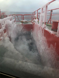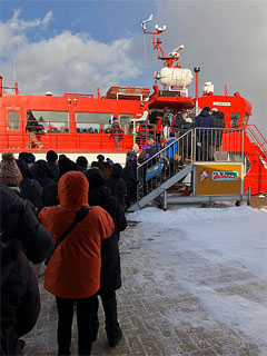 凍てつく風の中でも心をときめかせる初体験~~≪流氷砕氷船=ガリンコ号≫は氷が張り詰めたオホーツク海に出航~~その先端部の両脇にある氷を砕く装置で氷を砕きながら突き進んで行くのです:-))))))))))