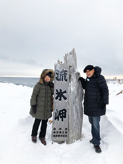 ≪流氷岬≫の碑の前で智女と私 ガリンコ号のフル・S