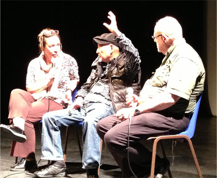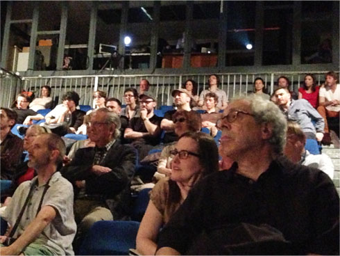質問をする観客 通訳をするクリステーヌさんとテシエさん 街外れにある劇場でしたが、ほぼ満席