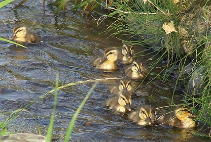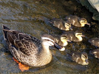 bR 好奇心旺盛な子ガモたち〜〜 今年は少なく、雛は五羽 だけだった (今回は失敗〜来年は雛がもっと可愛い時期に狙ってみます) |