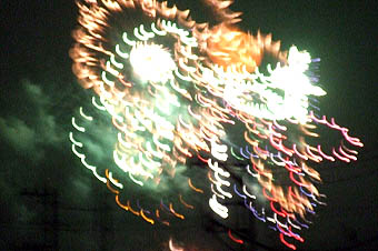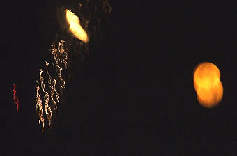 | bP 先日、これまでに見たことのないでっかい赤い月が 昇ったので見とれていると、 突然そこに火の花が重なった。 聖蹟桜ヶ丘の花火大会が始まったのだ。 卵の黄身のようなのがその月だが、 花火とのコラボレィションもよろしく 真夏の夜空をスクリーンに、見事な前衛アートを展開した! |