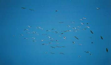 | bQ 優雅に舞うダイサギの群れ | bR そのダイサギに カワウの群れが加わっての大乱舞 |