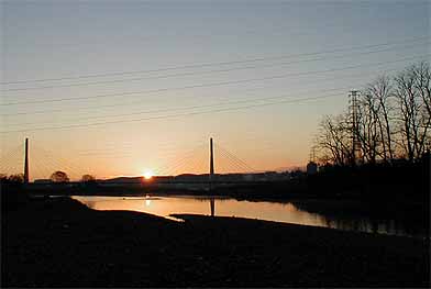 雲ひとつない穏やかな曙 〜〜 その清々しい大気に包まれて妻と川べりの砂利道を歩んでいると、やがて川面から水蒸気が立ち昇り、それを(逆光線で)赤く染めながらゆっくりと旭が昇って、一幅の絵のような風景をつくりました。