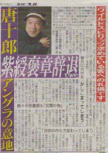 先日のことになりますが、〈夕刊 フジ〉を開くと「唐十郎 紫綬褒章辞退 アングラの意地」という大見出しが目に飛び込んできました――!その記事の中に「〜〜 褒章の受賞者は、衆参院議長や各省大臣らが推薦し、内閣総理大臣が審査したうえ閣議決定される〜〜」とありました。