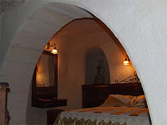 先人たちの知恵が引き継がれた、快適な住居 この家の娘さんが作った〈お嫁入り道具〉の品々 一方こちらは、岩山を刳り貫いて造られた洞窟ホテル 鑿跡も鮮やかな内装〜〜 カッパドキアならではの 粋なルーム!