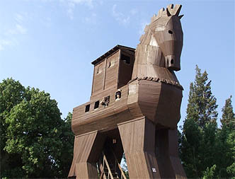 ところが、この〈木馬の話〉はホメロスの唄「イリアス」には欠落していて、他の吟遊詩人たちが唄い上げたものから〈トロイアの木馬〉の伝説が伝わっているのだそうです。(しかし、もうひとつの唄・「オデュッセア」の中には〈木馬の話〉はあります)