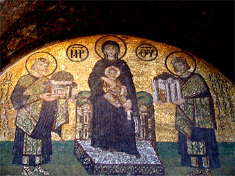 基本的にはビザンチン時代のままで、天井には〈聖母子像〉とても古いものとは思えない、キリストのモザイク 聖母子と二人の皇帝のモザイク