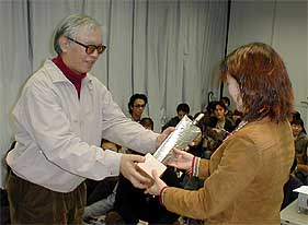 トロフィーを渡す鈴木志郎康さん 大賞受賞の神崎愛子さん