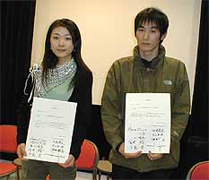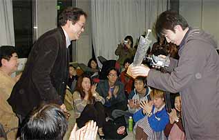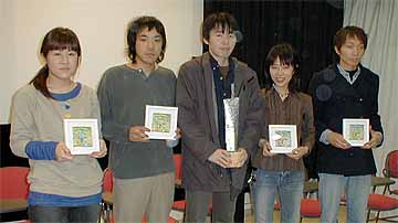 秋山祐徳太子氏制作のトロフィー 中島氏からトロヒィ−を受取る平田君 大賞:平田孝広 「The train」 入賞:ヤジマチサト 「ワイルドホーシズ」 大木千恵子 「つぶつぶのひび」 真利子哲也 「マリコ三十騎」 榎本健太郎 「東京毬藻」 技術賞:赤尾二郎 「熱帯中華」 女優賞:小林真紀 「wander」「天使の赤い臍」個展賞:岩本真里 「天使の赤い臍」 ※ 岩本(寺嶋)さんは既に国際的にも認められた映像作家です。 「天使の赤い臍」は他を圧する出来栄えでしたが、IF付属映像研究所は初心者を 対象にしたものですので別格 〜〜 IFシネマテークで個展が出来る「個展賞」に 決まりました。