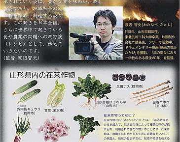 前作・「湯の里ひじおり-学校のある最後の年」(2007)に続いてふる郷・山形を取材したこのビデオ作品は、細々と残った県内の在来作物を山形大学農学部の准教授のアドバイスなどから探し出し、焼畑農業で栽培されている昔ながらの蕪栽培を初め、野菜市場では歓迎されなくなってしまった在来種の赤ネギ、ゴボウ、ナス、大根、ほうれん草などを農家の人たちなどの言葉を使って紹介してゆきます。